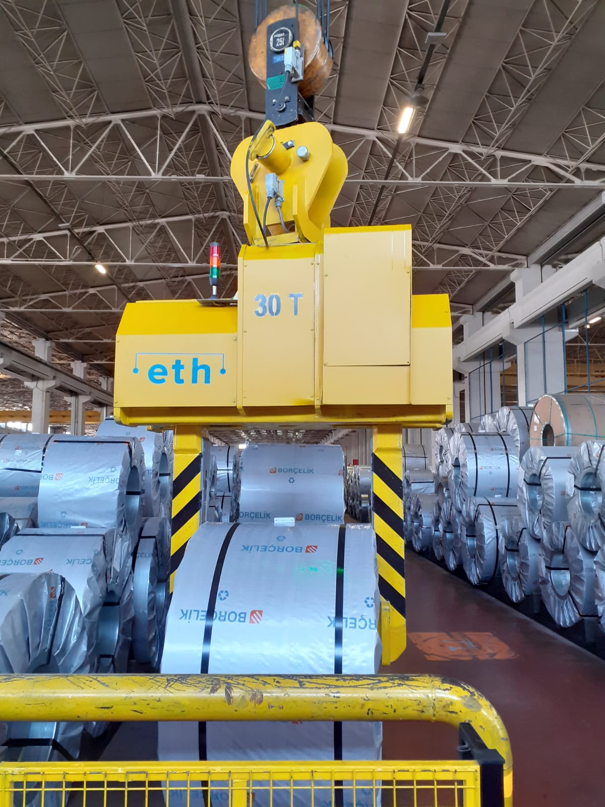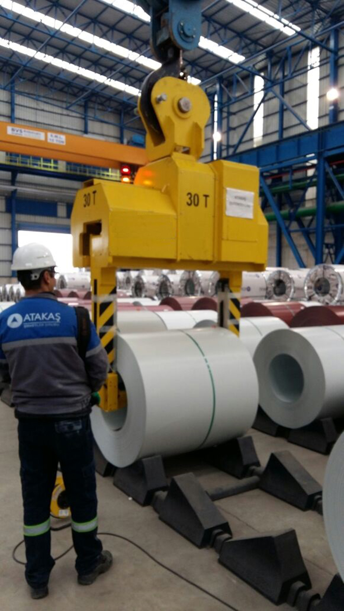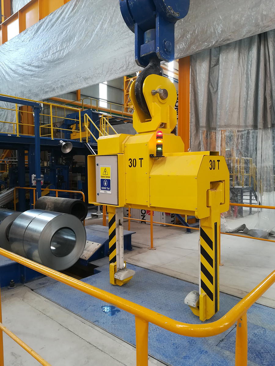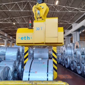 Der horizontale Coil Tong von ETH Mühendislik ist eine zuverlässige Lösung für das Heben, Drehen und Transportieren von Stahl-, Aluminium- und Papiercoils. Die robuste Konstruktion, die 360°-Drehfunktion und moderne Sensorik garantieren höchste Sicherheit und Materialschutz im industriellen Einsatz.