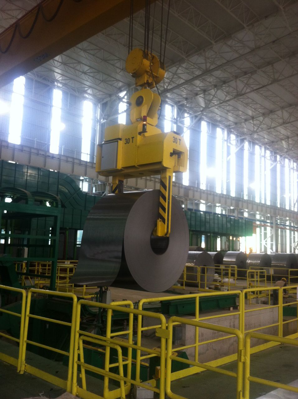 Der Kranführer nähert sich mit dem Coil Tong dem Coil.