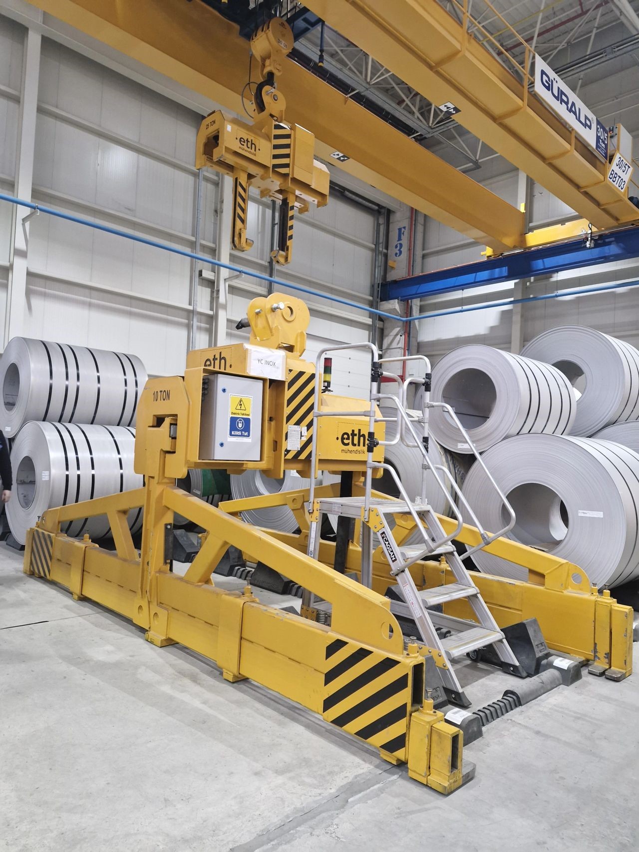 Dank der Lastsensoren, Greifarmverriegelung, Annäherungssensoren, Beschichtung an den Greifflächen sowie dem 360° motorisierten Drehmechanismus ist das Gerät ideal für den Einsatz in Stahlservicezentren und Industrieanlagen, wo Sicherheit und Effizienz höchste Priorität haben.